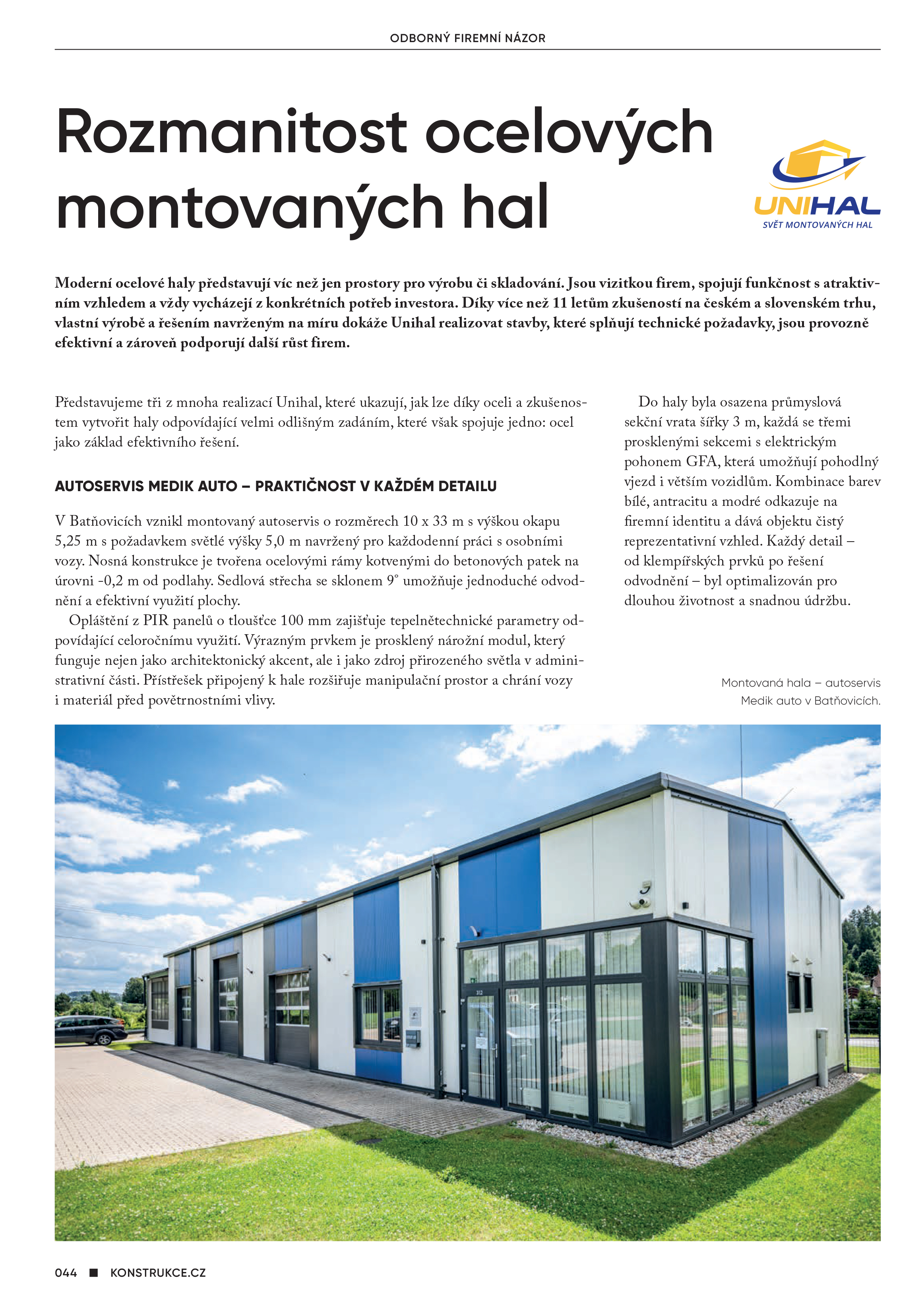 Představujeme v něm tři z našich realizací – autoservis Medik Auto v Batňovicích, výrobní halu Seedclean v Huštěnovicích a halu s logistickým provozem pro společnost DEOLOGISTIC v Mařaticích. Každý z těchto projektů dokazuje, že ocelové konstrukce Unihal umožňují přesná technická řešení, která zvyšují efektivitu provozu a odpovídají specifickým potřebám každého investora.