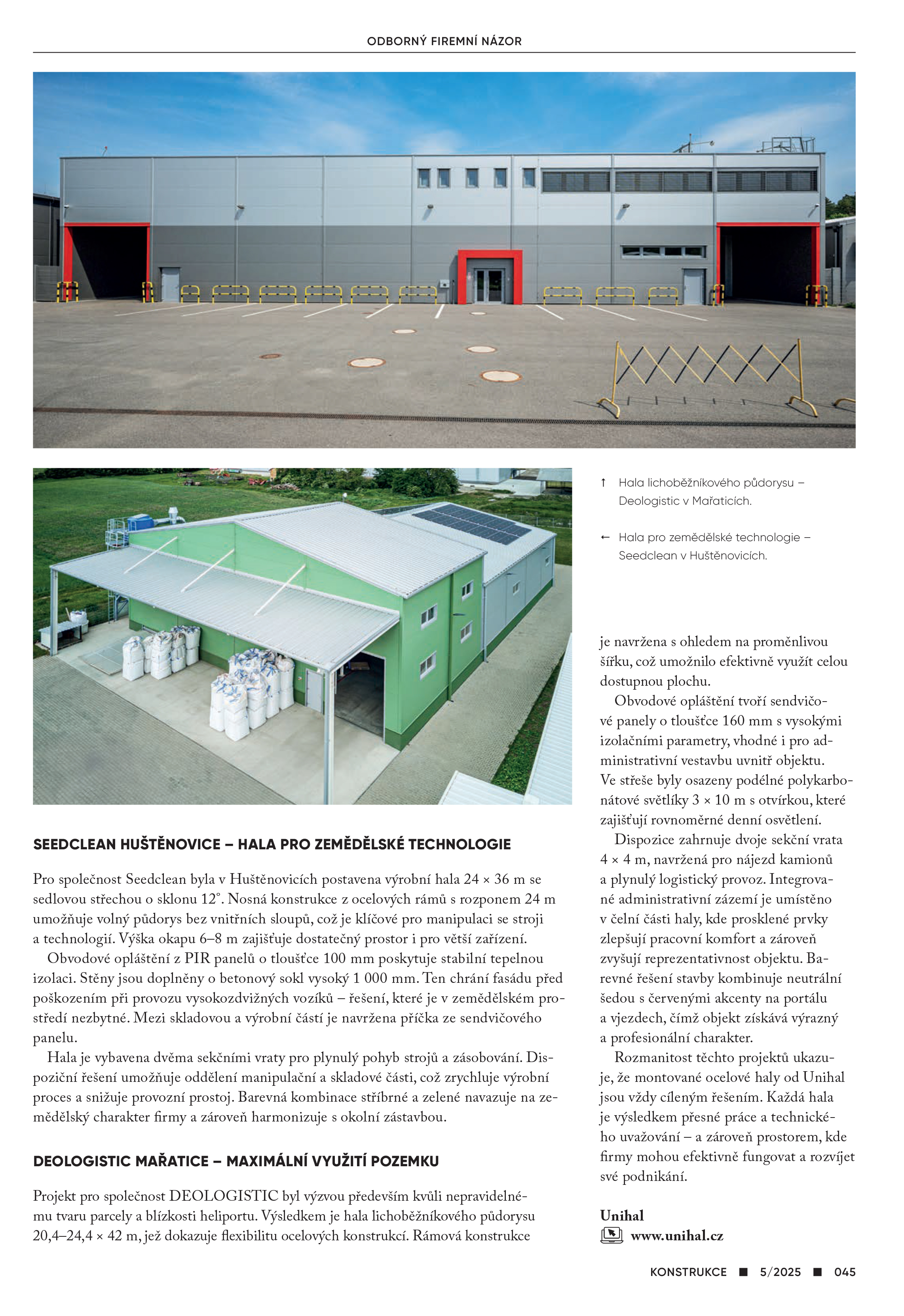 V nejnovějším vydání odborného časopisu KONSTRUKCE vyšel článek o společnosti Unihal s.r.o., který ukazuje, jak různorodé a přizpůsobivé mohou být montované ocelové haly.