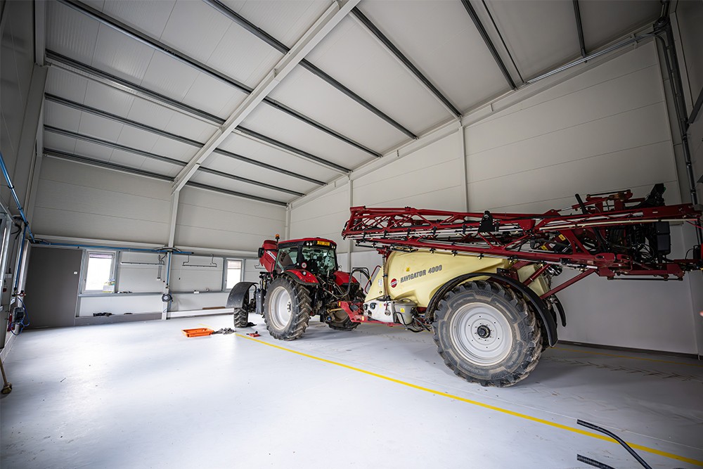 Provoz je rozdělen na dvě části. Větší část haly slouží jako sklad obilí. Menší část je využívána jako garáž a dílna pro údržbu zemědělské techniky. Garážový prostor je navržen až pro tři vozidla.