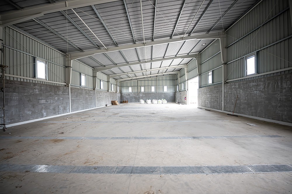 Podlaha je provedena z drátkobetonu o tloušťce 200 mm, který je navržen pro zatížení zemědělskou technikou i pro manipulaci se sypkými materiály. Betonový sokl ve skladové části má výšku 2,8 metru a chrání spodní část stěn před poškozením při plnění a vyprazdňování skladovaného materiálu.